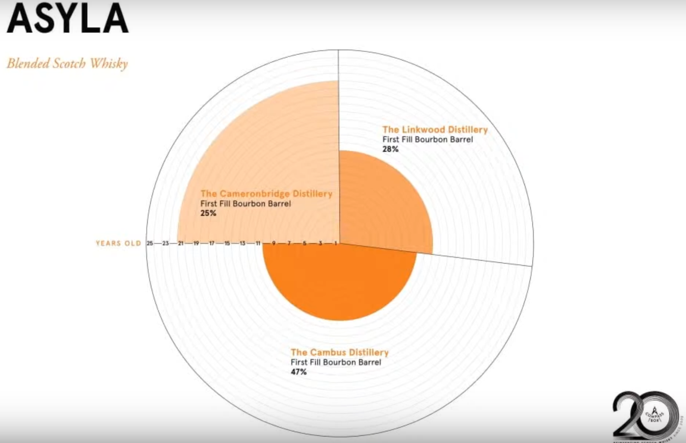 Der erste seiner Art. Asyla genannt aus 47% Cambus, 28% Linkwood und 25% Cameronbridge. Allesamt aus Bourbon Barrels mit bis zu 21 Jahren Lagerung. 43% haben die 1600 Flaschen. Für John Glaser wäre das sein „Desert Island Whisky“. Der Whisky den er für immer trinken könnte, wenn er nur einen mitnehmen dürfte. Der Name kommt von einem klassischen Stück, Asyla von Adés. Der Plural von Asylum. Was Glaser mit einem persönlichen Heiligtum assoziiert. Link zur Whiskybase