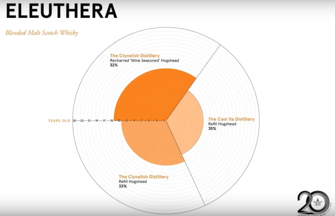 Eleuthera ist ein Blended Malt aus Clynelish und Caol Ila, 12-14 Jahre alt. Abgefüllt in 2002 mit 46%. Ursprünglich war geplant auch noch Linkwood rein zu blenden. Da der Caol Ila aber nicht so viel Whisky enthielt wie geplant hat Glaser das Rezept geändert. Der Name kommt von Island of Eleuthera, auf dem Glaser immer wieder Urlaub gemacht hat. Dort hat er beschlossen Compass Box zu gründen. Das Wort an sich heißt Freiheit und das bedeutete für Glaser auch die Gründung eines eigenen Unternehmens. Link zur Whiskybase